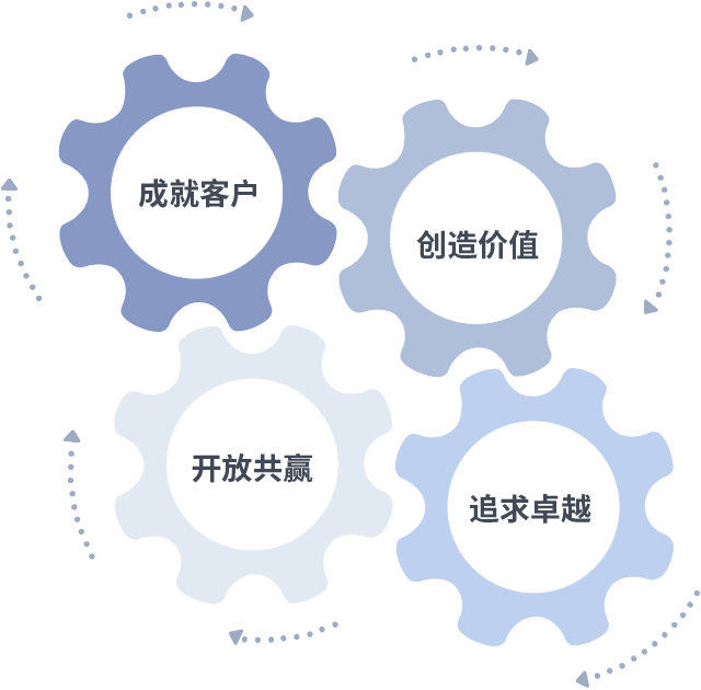 成就客户是一切决策的出发点,,创造价值是衡量所有工作的标准,,,,追求卓越是我们做事做人的态度,,开放共赢是我们的格局也是最终的结果。。。价值观的齿轮环环相扣,,推动着组织里的每个人不断向前。。。