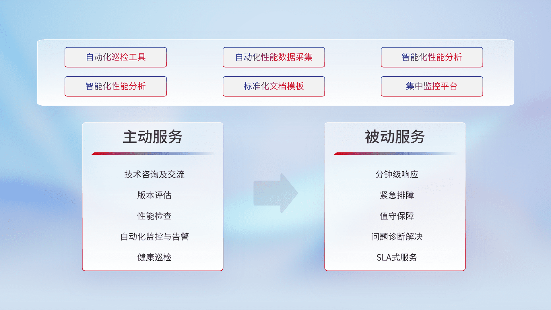 智能化工具和标准化文档,,保障服务质量,,提供主动服务(包含技术咨询、、、、版本评估、、、性能检查、、、自动化监控与告警、、、、健康巡检)和被动服务包含(分钟级响应、、、紧急排障、、值守保障、、、问题诊断解决、、SLA服务)。。。。